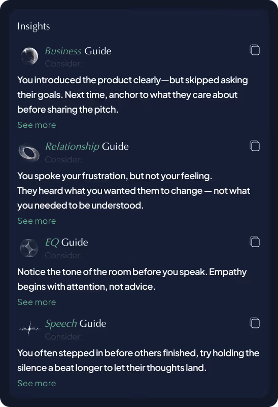 AI-powered guides give in-the-moment coaching across speech, relationships, business, and mental resilience.